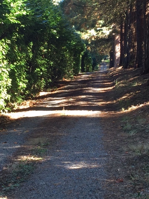 But that wasn’t what I needed, and that wasn’t what I did. Instead, I took it easy. I sat outside or inside, reading for hours on end. I watched the doe and fawn who came by almost every morning and evening to eat the garden. I listened to the birds (finches, chickadees, woodpeckers… ostriches? pterodactyls?). I dodged the yellow jackets that plagued me while I ate lunch. When I felt like moving, I walked up and down the level, quarter-mile gravel drive—up and down, up and down, up and down… walking along the magnificent row of sequoias that line the drive, past a few small pastures where there were occasionally rabbits or coyotes.